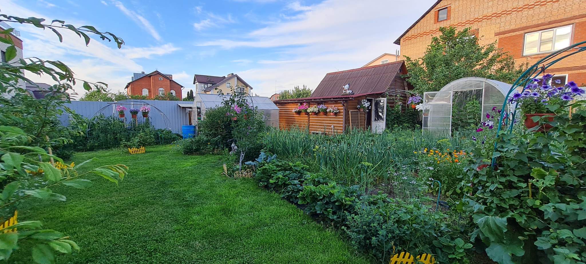 Отдельно стоящие 3 теплицы из поликарбоната (3х6), подготовленные отдельные грядки для посадок, множество плодоносящих деревьев (инжир, алыча, слива, абрикосы, виноград, яблони, груши, черная рябина, орех-фундук, а также кусты черной смородины и крыжовника.